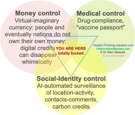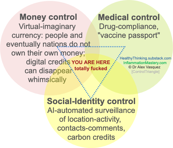 My updated globalist control triad diagram (provided below in PDF; originally published 27sep2025) now includes more details, especially regarding carbon credits. As I recently said on 12oct2025, eventually governments are going to create so many rules that nobody will be able to maintain compliance and thus everyone will be vulnerable to penalty, violence, and “quarantine.”