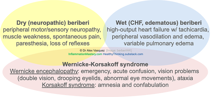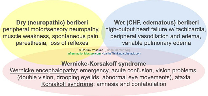 Wet (CHF, edematous) beriberi: high-output heart failure w/ tachicardia, peripheral vasodilation and edema, variable pulmonary edema. Wernicke-Korsakoff syndrome: Wernicke encephalopathy: emergency, a