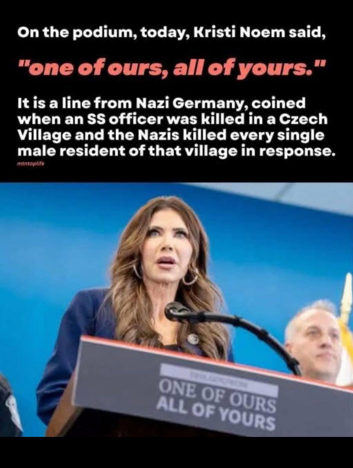 Homeland Security Secretary Kristi Noem ignited a firestorm after appearing at a press conference behind a podium displaying “One of Ours, All of Yours” shortly after Renee Good’s tragic death. Social media erupted, branding the slogan a Nazi-era call for collective punishment, akin to reprisals during World War II. The phrase evokes the Lidice Massacre in June 1942, where Nazis retaliated for Reinhard Heydrich’s assassination by wiping out the Czech village. SS forces shot nearly all men over 14, sent women to Ravensbrück camp, and scattered children—some gassed at Chełmno, others Germanized. They then razed the site, killing about 340 in a symbol of terror tactics.2