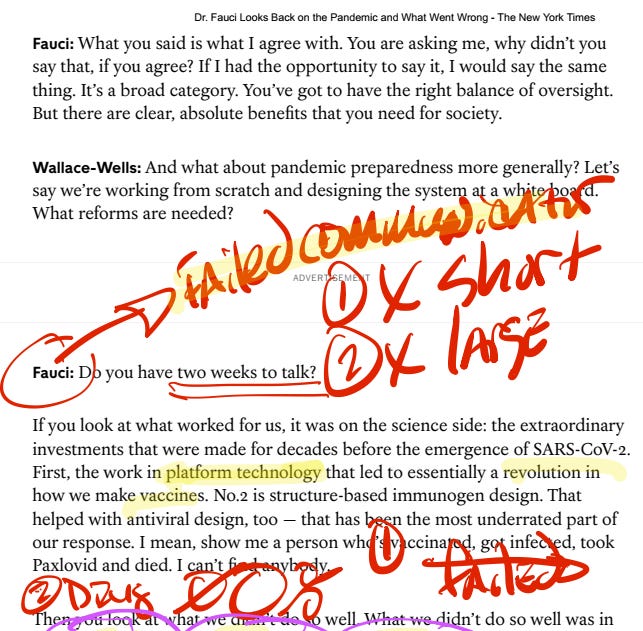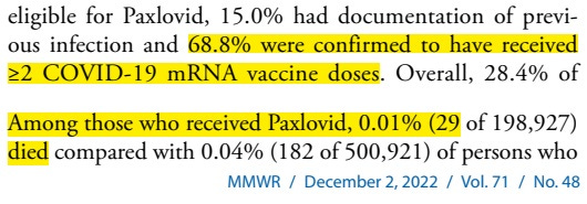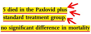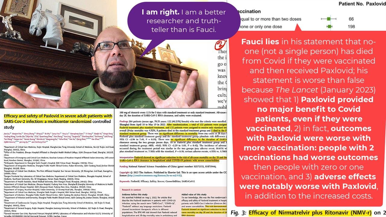In his Apr2023 interview in the New York Times, Fauci claims that no-one has died from Covid if they are vaccinated, got severely ill anyway because the vaccine did not protect them, then received Paxlovid; he is lying because his statement is false and he had plenty of time and resources to see the evidence published in The Lancet 5Feb2023 showing that Paxlovid provided no major benefit in survival—5 patients in the Paxlovid group died which directely proves that Fauci is lying—and that outcomes were actually worse among people who were vaccinated (in a dose-response relationship).