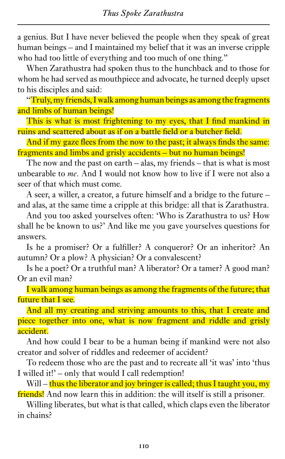 “Verily, my friends, I walk amongst men as amongst the fragments and limbs of human beings! This is the terrible thing to mine eye, that I find man broken up, and scattered about, as on a battle- and butcher-ground. And when mine eye fleeth from the present to the bygone, it findeth ever the same: fragments and limbs and fearful chances—but no men!” Nietzsche in Zarathustra