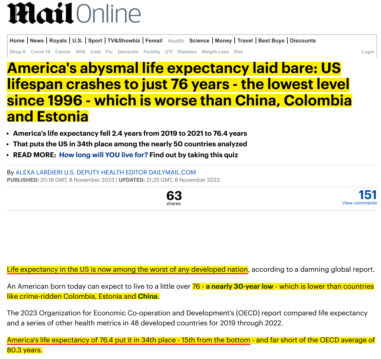 Life expectancy in the US is now among the worst of any developed nation, according to a damning global report. An American born today can expect to live to a little over 76 - a nearly 30-year low - which is lower than countries like crime-ridden Colombia, Estonia and China. https://www.dailymail.co.uk/health/article-12725637/america-life-expectancy-crashes-lower-slovenia-colombia.html