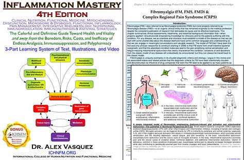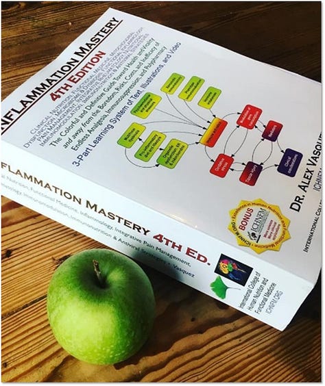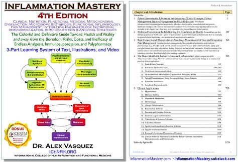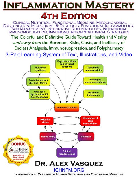Inflammation Mastery 4th Edition combines the recently updated Functional Inflammology and Dr Vasquez’s previous Integrative Rheumatology into a new colorized updated textbook of almost 1,200 pages. This work is the culmination of several thousand research publications combined with Dr Vasquez’s many years of clinical experience and teaching graduate-level students and doctorate-level clinicians worldwide. With radiographs, photos, acronyms, illustrations, flowcharts, and detailed-yet-simplifying explanations, Dr Vasquez makes it easier than ever for clinicians to grasp important concepts in integrative care and functional medicine and then to translate the basic science research and molecular biology into treatment plans that can be explained and used in “the real world” of clinical practice with patients. The associated video tutorials and recorded live conference presentations further help students and clinicians “get it” via Dr Vasquez’s effective teaching style which embraces complexity while always emphasizing clinical applicability and psychosocial context. The Inflammation Mastery & Functional Inflammology series of books and videos translates important concepts and nutritional/biomedical science into easy and practical clinical applications for the prevention and treatment of disorders of sustained inflammation, which Dr Vasquez describes as “patterns of metabolic disturbance and inflammatory dysfunction” existing in three sequential and overlapping categories: 1) metabolic inflammation, 2) allergic inflammation, 3) autoimmune inflammation. This book includes access to video presentations which introduce the origin and components of the Functional Inflammology Protocol and FINDSEX® acronym. Post-publication updates to this information and important social and clinical contextualization are made available in videos and online repositories (access provided in the book), and the e-newsletter available from InflammationMastery and FunctionalInflammology.com. This textbook also provides access, via reprints or hyperlinks, to Dr Vasquez’s published articles—an example of which is his recent paradigm-shifting editorial published in the journal Alternative Therapies in Health and Medicine (2014 January). The updated section on pain management allows students and clinicians to understand and apply manual, pharmacologic, nutritional and botanical medicine treatments for musculoskeletal pain, thereby providing better relief for patients and avoiding the hazards of NSAIDs, coxibs, steroids, opioids, immunosuppressants/immunoparalytics and biologics.