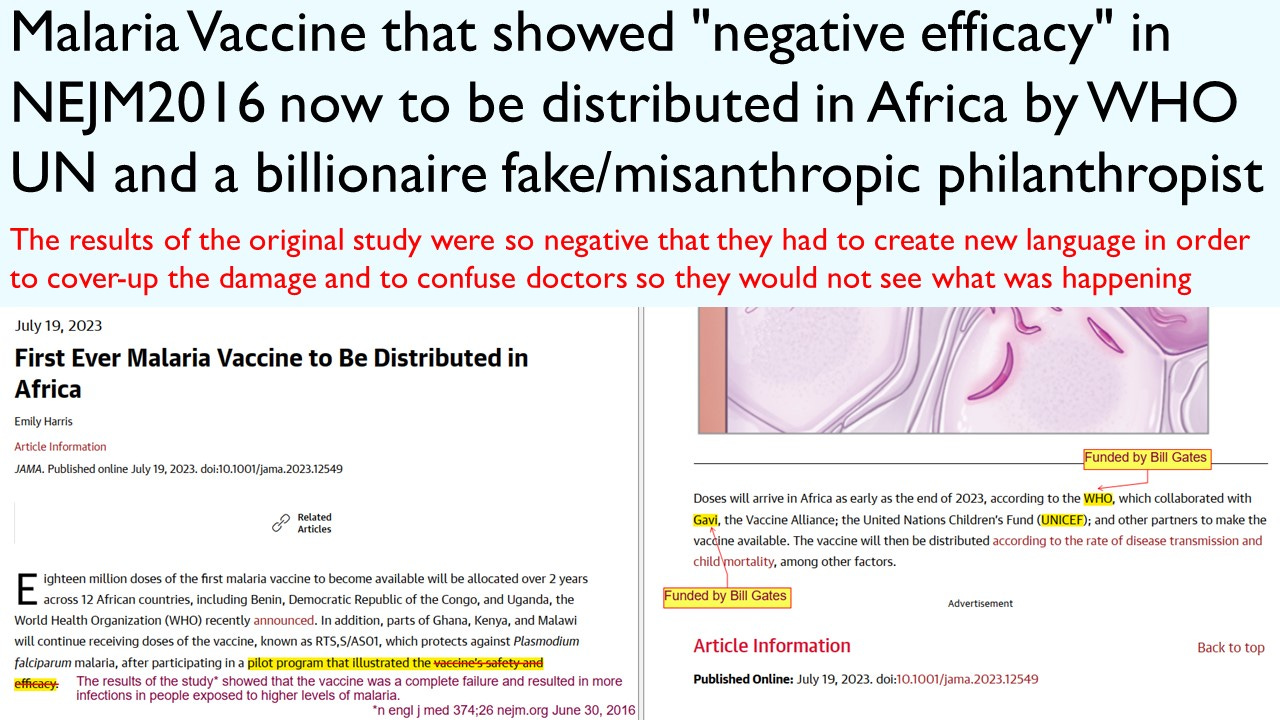 Malaria Vaccine that showed "negative efficacy" in NEJM2016 now to be distributed in Africa by WHO UN and a billionaire fake/misanthropic philanthropist