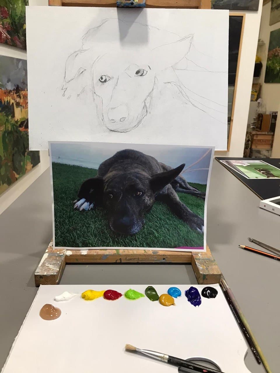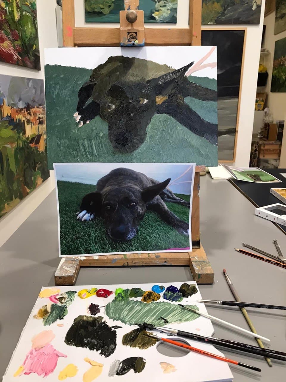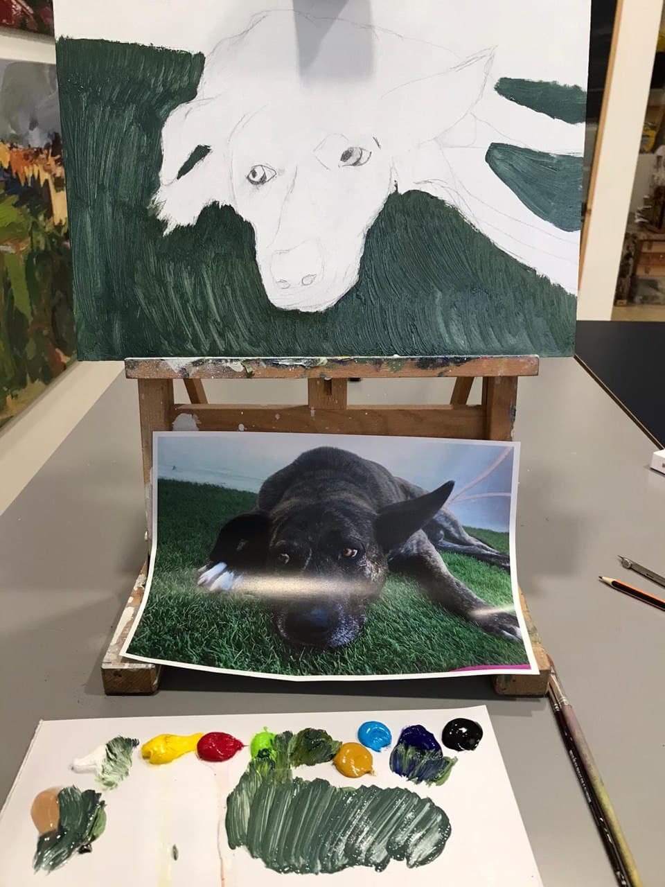 My best-dog-ever died unexpectedly last Monday. On Thursday, I randomly passed by an art studio and —mostly asking on behalf of my girlfriend— inquired about the classes. Today we both attended a 2-hour session, and I started outlining Bruno in oil paints. I’d not drawn with a pencil since 35 years ago and not really painted (except for walls and doors) since about 38 years ago, which is the last time I experimented with water-color painting. You can see the progress in the photos below, interposed with quotes from Bob Black’s famous essay Abolition of Work, which I have also included below in PDF and video formats.