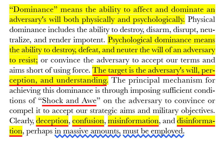 NONLINEAR WARFARE is the intentional and strategic creation of confusion, contradiction, social-intellectual chaos to leave the population in a stunned state of decision paralysis and nondirection/nihilism, thereby politically eliminating millions of people from having political influence, thus allowing the controllers/elite to do as they wish, which is always their goal. As noted in the official document provided below, the primary target of “rapid dominance” via “shock and awe” is the mind—
