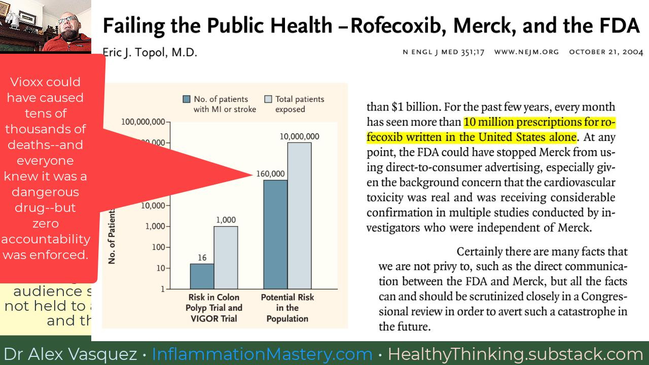 The Vioxx scandal in 2004 injured-killed tens of thousands of people, but we as an American society enforced zero accountability, thereby sending the message that we approve of government-pharma collusion that kills our own citizens.